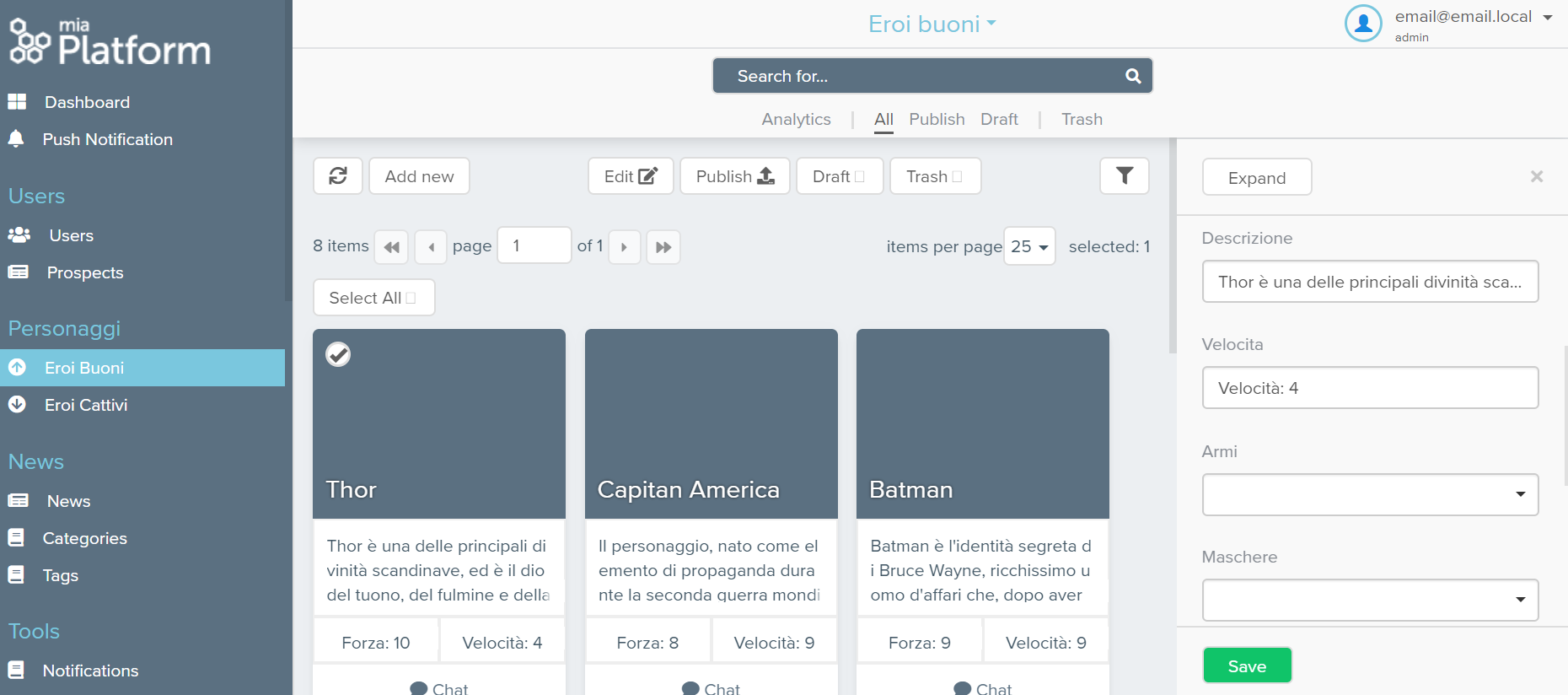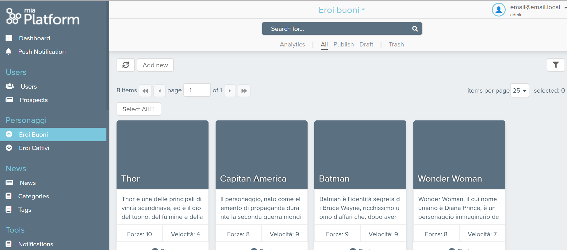 layoutType | table | you can decide the layout you want to give to your collection. table is the most classic table view mode. tableUser is the display mode for users. It has in fact a special Reset Password field at the beginning of the table. tablePush instead is the perfect table for push notification or to send notifications to customers. Next to the table you will always find a push button to inject the content to your customers. If you select card each item will be represented similar to a card. gallery is instead the perfect representation for images |