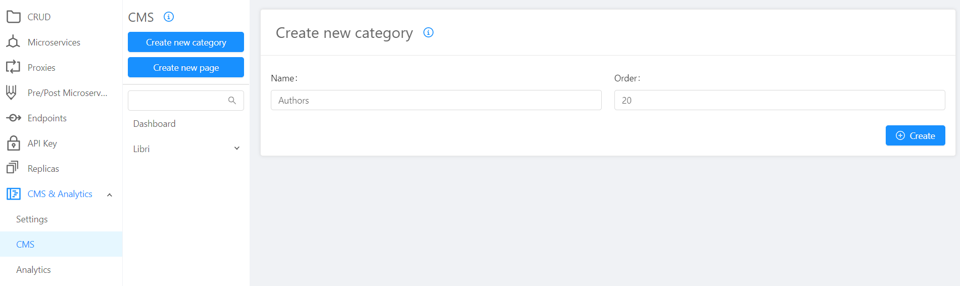 To create a category, simply enter the Name of the Category you want to display on the CMS and the display order.