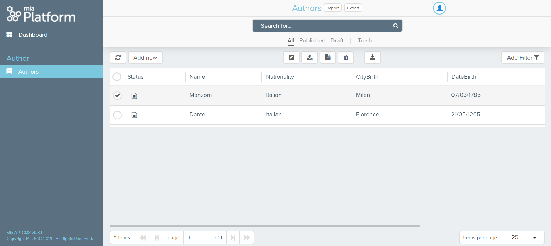 Enable Delete: activating this check, you enable the permanent deletion of items from the database. A CMS user will be able to perform the permanent deletion navigating in the "Trash" section and clicking on the "Delete" button.