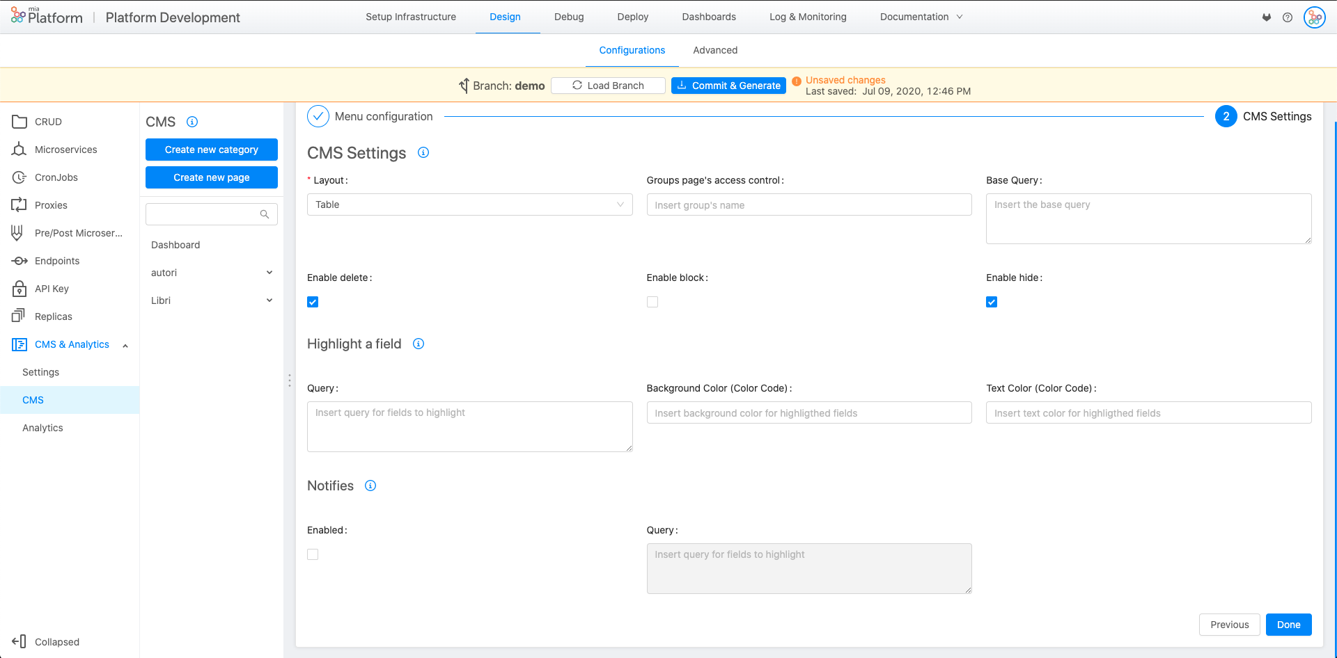 The CMS provides a way to dynamically integrate external custom frontends into a dedicated side menu option.
