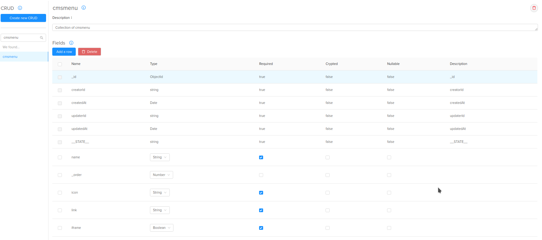 First of all you need a CRUD named cmsmenu where you can store the menu options you want to create: