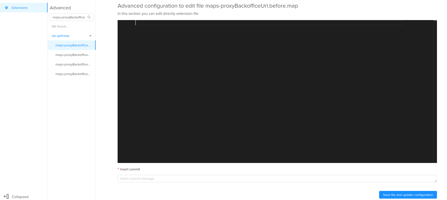 The last step is to configure the route to go in the correct microservice. To do this you need to go in the advanced section of the console and manage the Api Gateway backoffice files. The extensions to customize are: